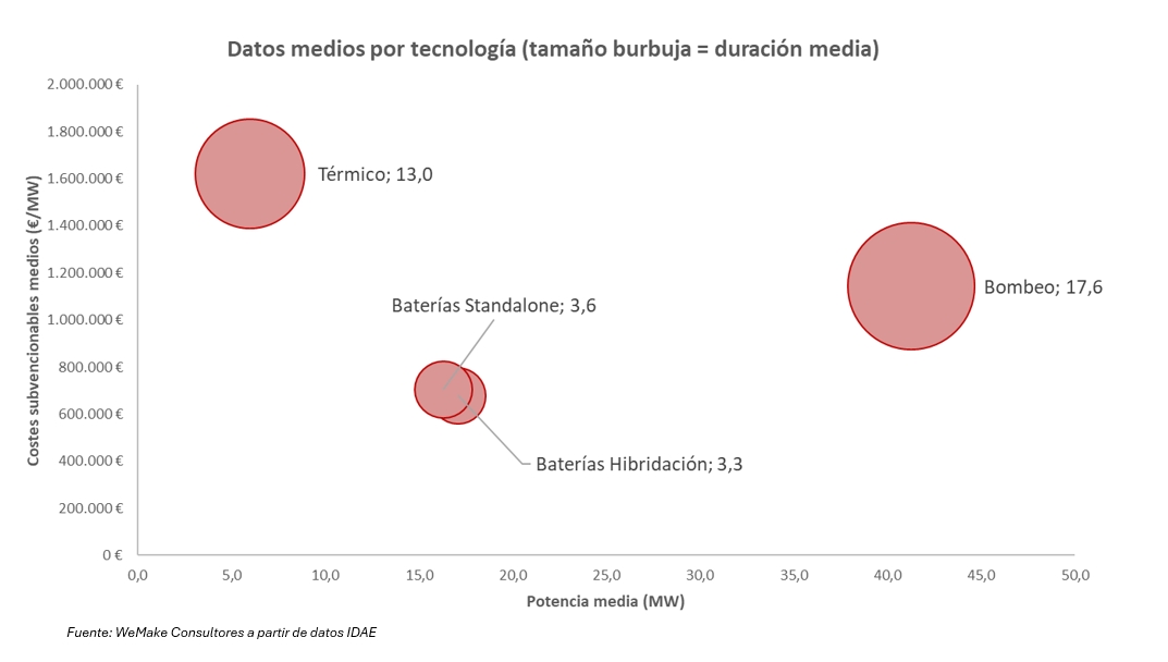Battery projects are the most competitive in terms of cost, with an average of around €700k/MW in eligible costs. At the other end of the scale are thermal projects, which are also the smallest in terms of power. In terms of size, pumped storage projects are clearly the largest in terms of both average power and capacity, exceeding an average of 17 hours of storage. Battery projects have an average duration of 3.5 hours, which is sufficient for arbitrage applications.