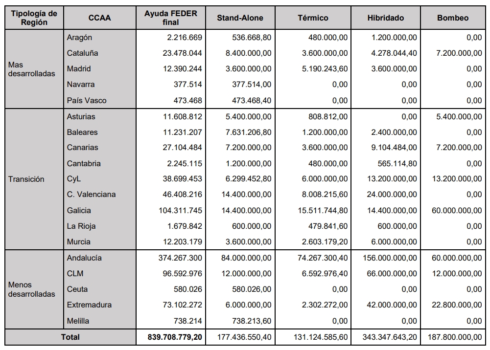 A total of €840 million has been awarded, 20% more than the €700 million initially planned. In terms of distribution by autonomous community, projects in Andalusia have received 45% of the funds, followed by Galicia with 12% and Castilla la Mancha with 11%.