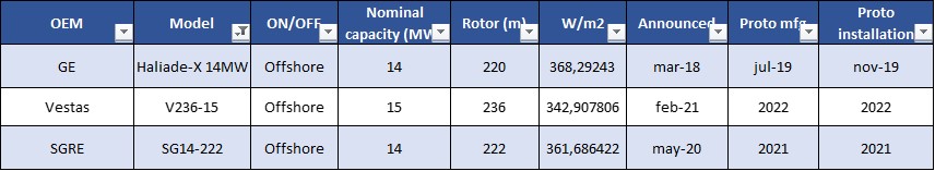 It was the first turbine of the trio to be announced in March-2018 and already has a operating prototype in the port of Rotterdam since the end of 2019. This model is a clear example of the uprating strategy that manufacturers apply to their models as they gain operational experience: it was launched with 12 MW but in Oct-20 it was already uprated to 13 MW and just 2 months later, a 14MW version was announced. There is no doubt that the fierce competition between the 3 models is accelerating this process.
