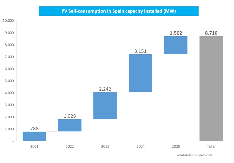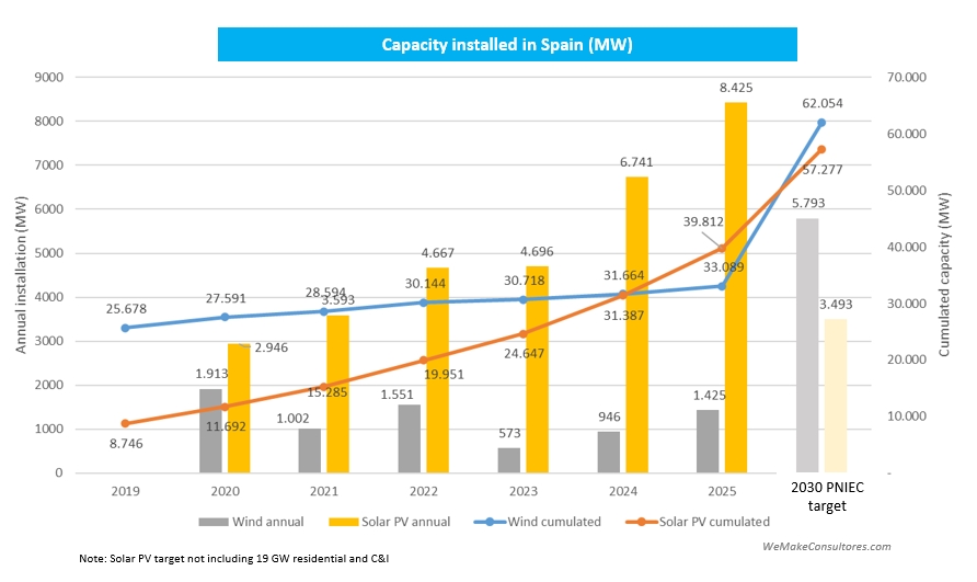 • In terms of installed capacity, according to provisional data from REE, solar power would have set a new record in 2025 with 8.4 GW installed. Excluding self-consumption, the PNIEC target is 57 GW in 2030, which means that at an average of 3.4 GW per year, solar power would achieve the target, which seems very feasible.