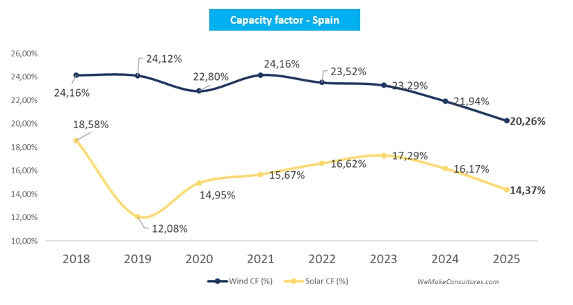 • In terms of capacity factor, wind power is accentuating its downward trend and reaching an all-time low. Solar power is also falling this year, continuing the trend that began last year.