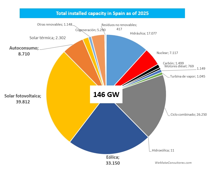 • In terms of total capacity, solar photovoltaic is already the most widely installed technology in Spain, with almost 40 GW by the end of 2025. If we add the almost 9 GW of self-consumption, solar is close to reaching the 50 GW barrier.
