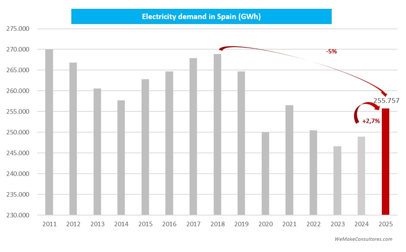 The trend that began last year is confirmed, with demand growing by 2.7% in 2025. If we added the estimate for self-consumption, we would already be close to the 2018 peak. Nevertheless, electrification remains a pending issue and we need to increase demand much more, as we mentioned in a previous post on this blog.