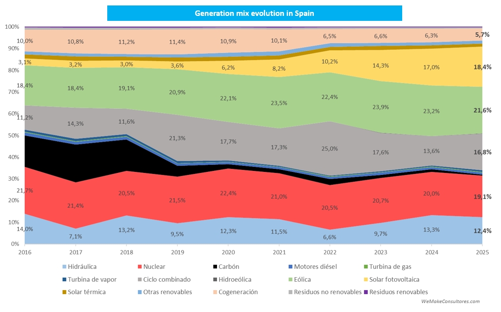 As Red Eléctrica itself announced in December, wind power is once again the leading source of electricity generation in Spain with 21.6%. It is followed by nuclear power, while photovoltaic power continues its unstoppable rise and is the third most important source for the second consecutive year. Looking at the evolution over the last nine years, we can see the significant growth of solar power, which has gone from a negligible 3% to 18.4%. In total, renewables (including hydro and others but excluding self-consumption) generated 55.5% of electricity in 2025, and if we add nuclear power, 77% of generation was CO2-free.