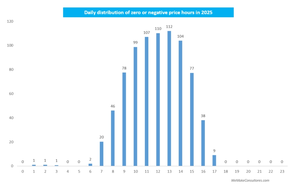 • Many negative or very low-price hours. More than 800 hours in 2025 were at zero or negative prices, representing 9.2% of total hours.