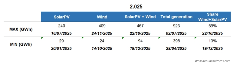 • On 24 November, wind power generation reached its daily maximum with 409 GWh of production, almost 7% below the 2024 maximum.